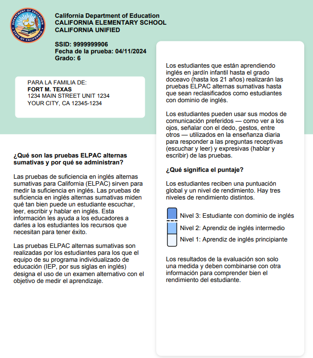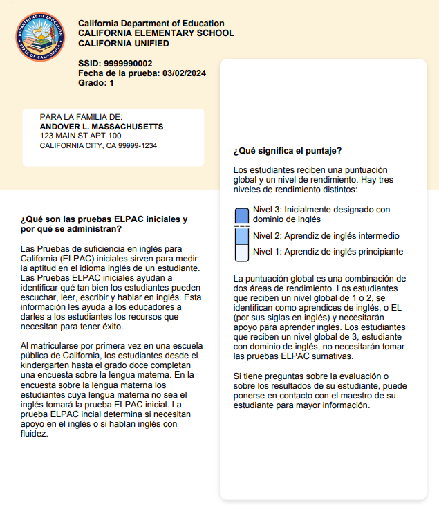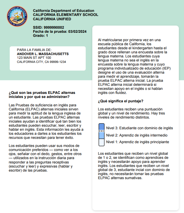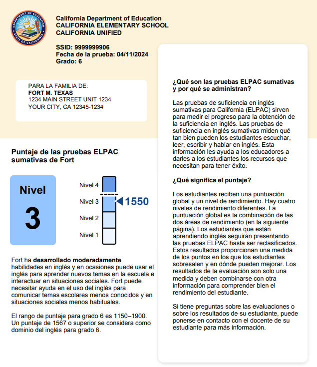 Nadie conoce a su hijo/a ni sus necesidades más que usted. Starting Smarter le proporciona los recursos y la información para ayudarle a utilizar el informe de puntaje de ELPAC de su hijo/a y comprender las áreas en las que su hijo/a se destaca y en las que puede mejorar. Todo esto puede iniciar una conversación con los docentes de su hijo/a sobre cómo se puede apoyar el aprendizaje y el progreso de su hijo/a en la escuela y en el hogar durante todo el año.